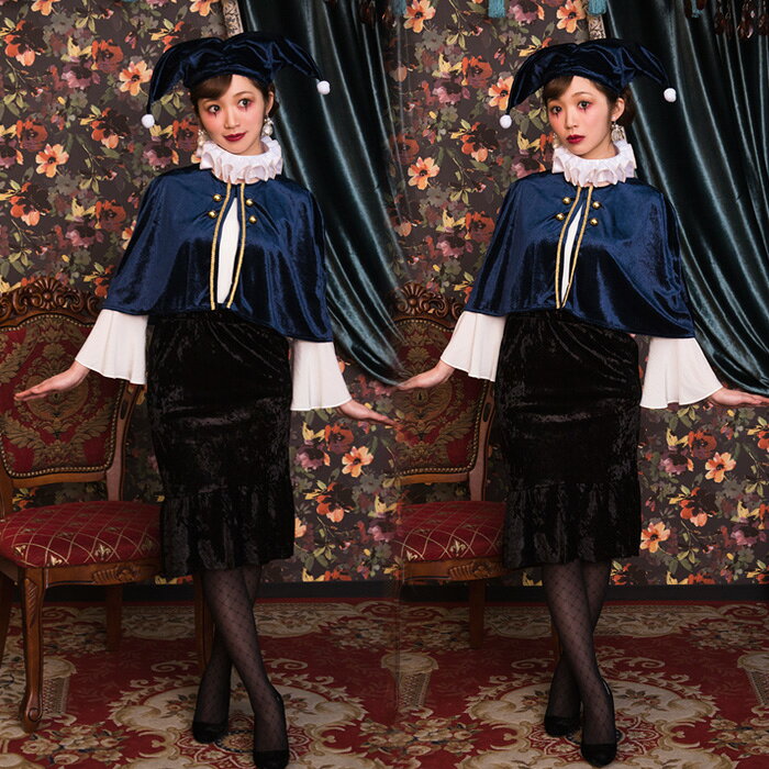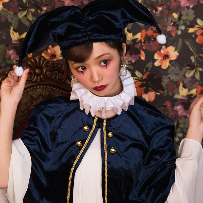 ≪Costume/Halloween≫ティアーズピエロマントセットポンポンがついたピエロ帽子がポイント!ネイビーにゴールドのブレードとボタンが映えてステキです。